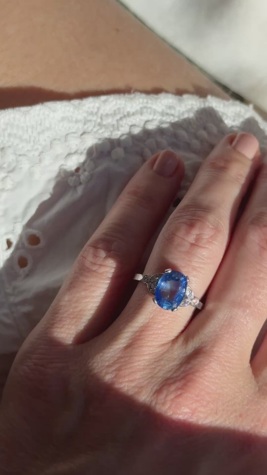 Antique Art Deco engagement ring centered with a GIA certified 2.99 carat Ceylon no heat oval sapphire and approximately .40 carats of marquise and round cut diamond accents within a platinum setting. Ceylon sapphires from this period were celebrated for their vibrant, untreated blue hues which were considered among the finest in the world.