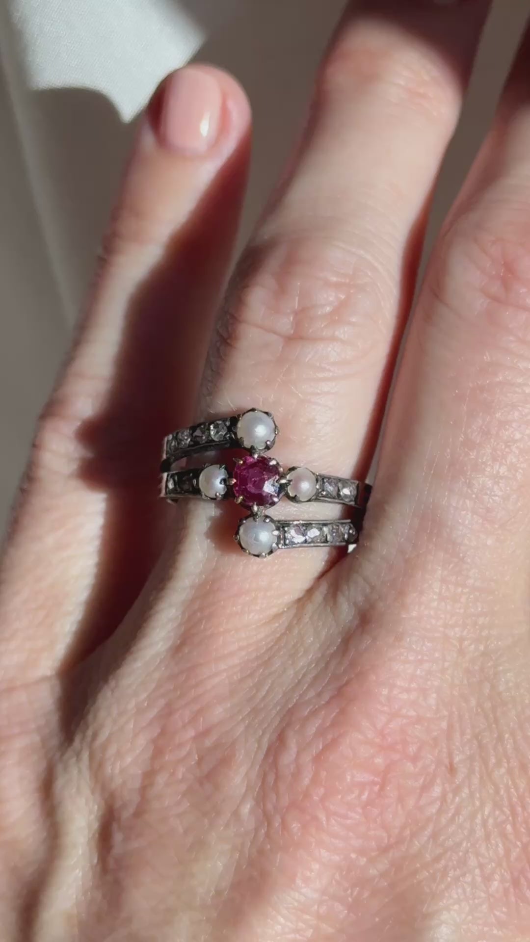 Antique Georgian ring centered with a ruby weighing .35 carats with accent button pearls and approximately .60 carats of rose cut diamonds within a 14k gold setting.