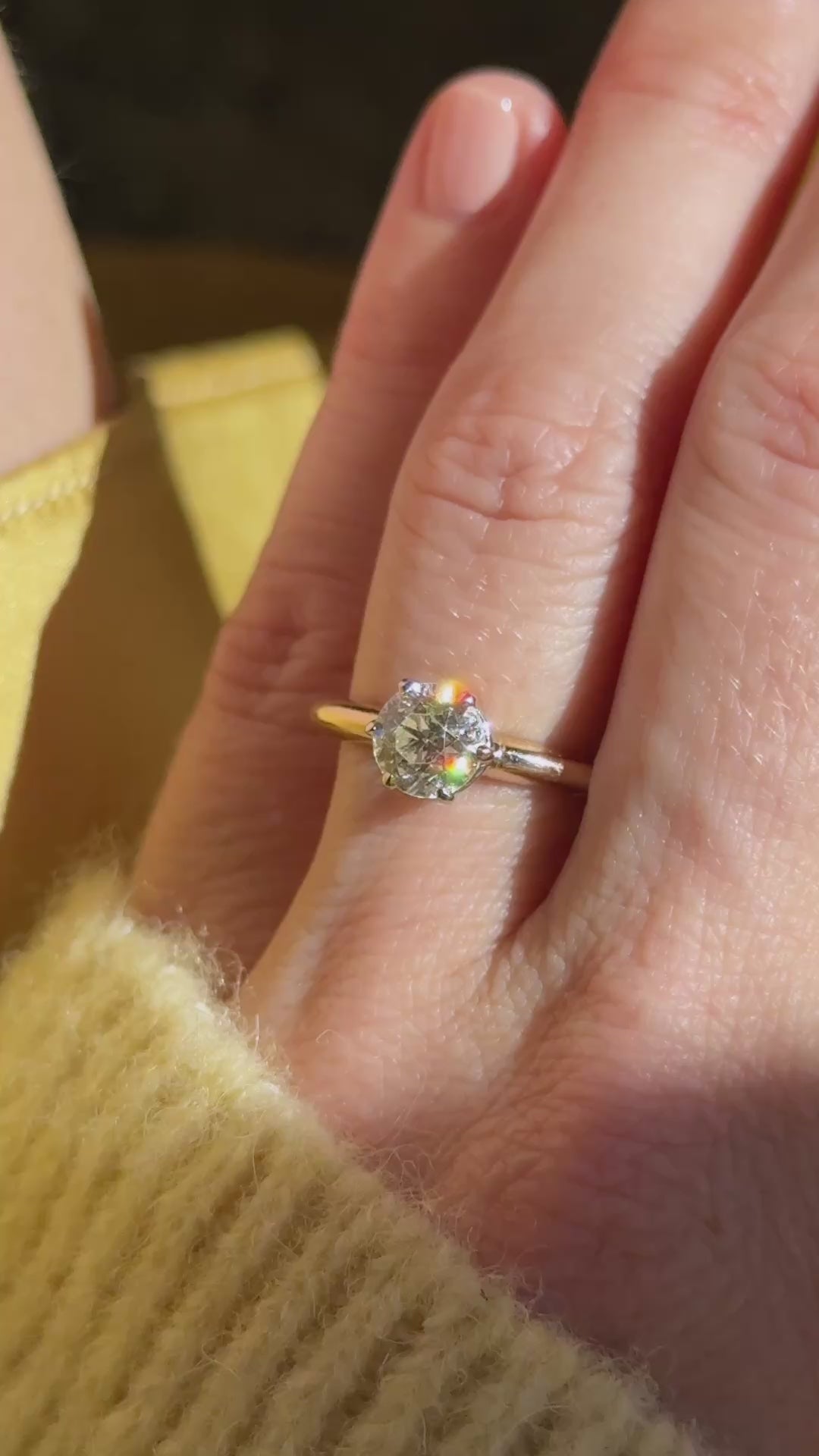 Midcentury vintage engagement ring centered with a GIA certified 1.20 carat old European cut diamond within a 14k yellow gold setting. The ring features a six prong platinum basket with an open, crown-style design that lifts the diamond to capture light while maintaining a clean, balanced look.