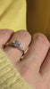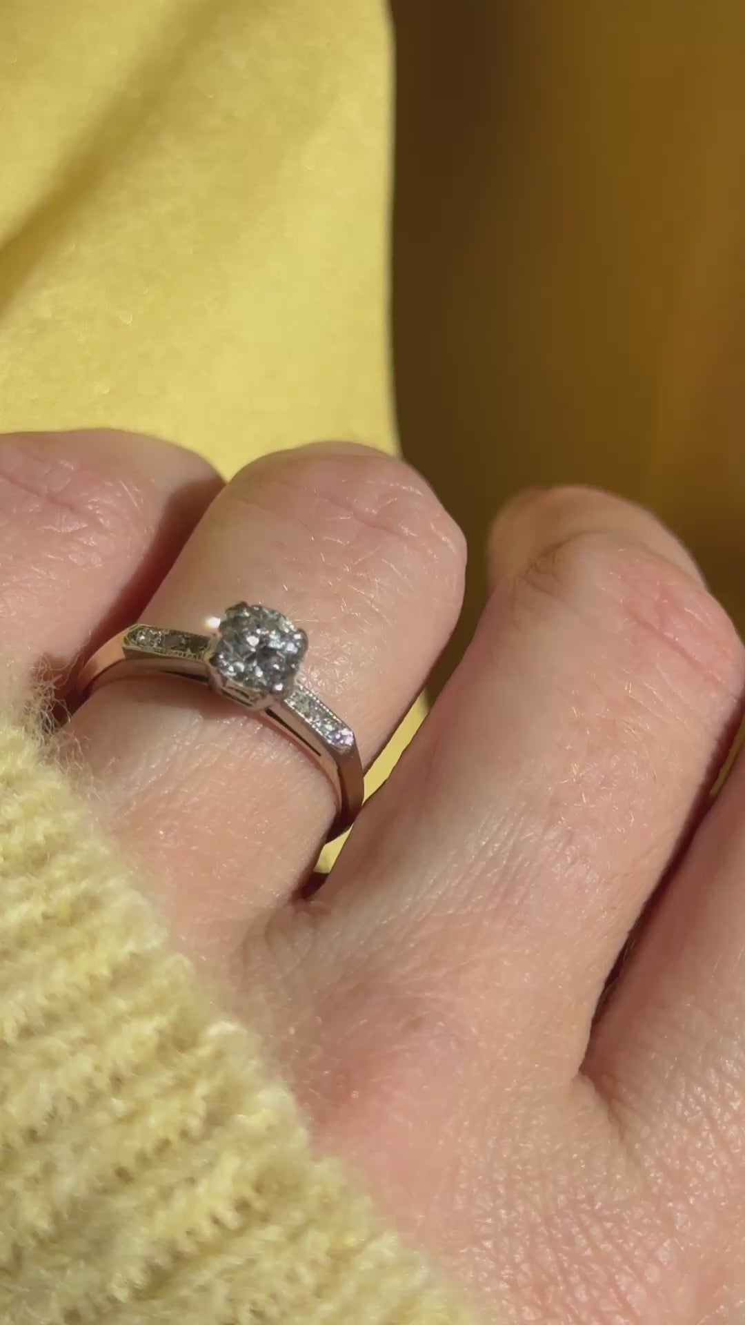 Midcentury vintage engagement ring centered with a .65 carat old European cut diamond center and .15 carats of single cut side diamonds within a 14k yellow gold setting. This Midcentury design features clean lines and a balanced design. The mix of an old European cut diamond with a 14k yellow gold band reflects the era’s shift toward simple, timeless settings that emphasized the beauty of the stone.