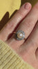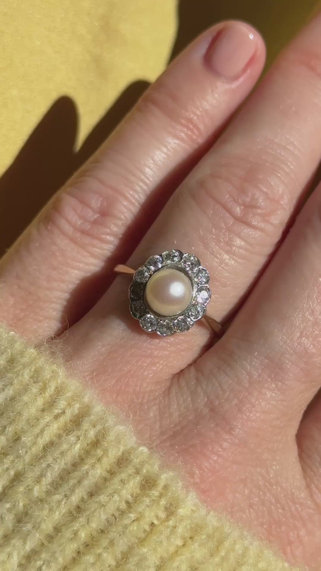 Victorian antique engagement ring centered with a pearl with an approximately .60 carat old European cut diamond surround within an 18k yellow gold and platinum setting. Cluster rings with pearls and diamonds were common in the Victorian era and often chosen for their symbolic meaning.