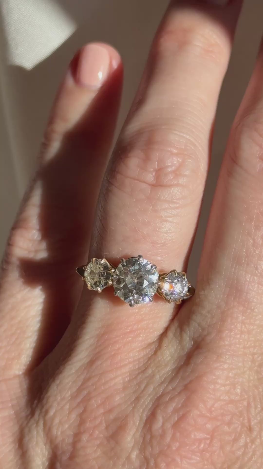 Antique Victorian three stone engagement ring centered with a GIA certified 1.38 carat old European cut diamond and .97 carats of side diamonds within a carved 15k yellow gold setting. The classic three stone design, symbolizing the past, present, and future, was a cherished motif of the era, representing enduring love and connection. 15K yellow gold was a hallmark of antique English jewelry before 18K became the standard. Viewed in profile, you can see beautiful scrollwork decorating the shoulders, and the ring sits low to the finger for a comfortable, elegant fit.