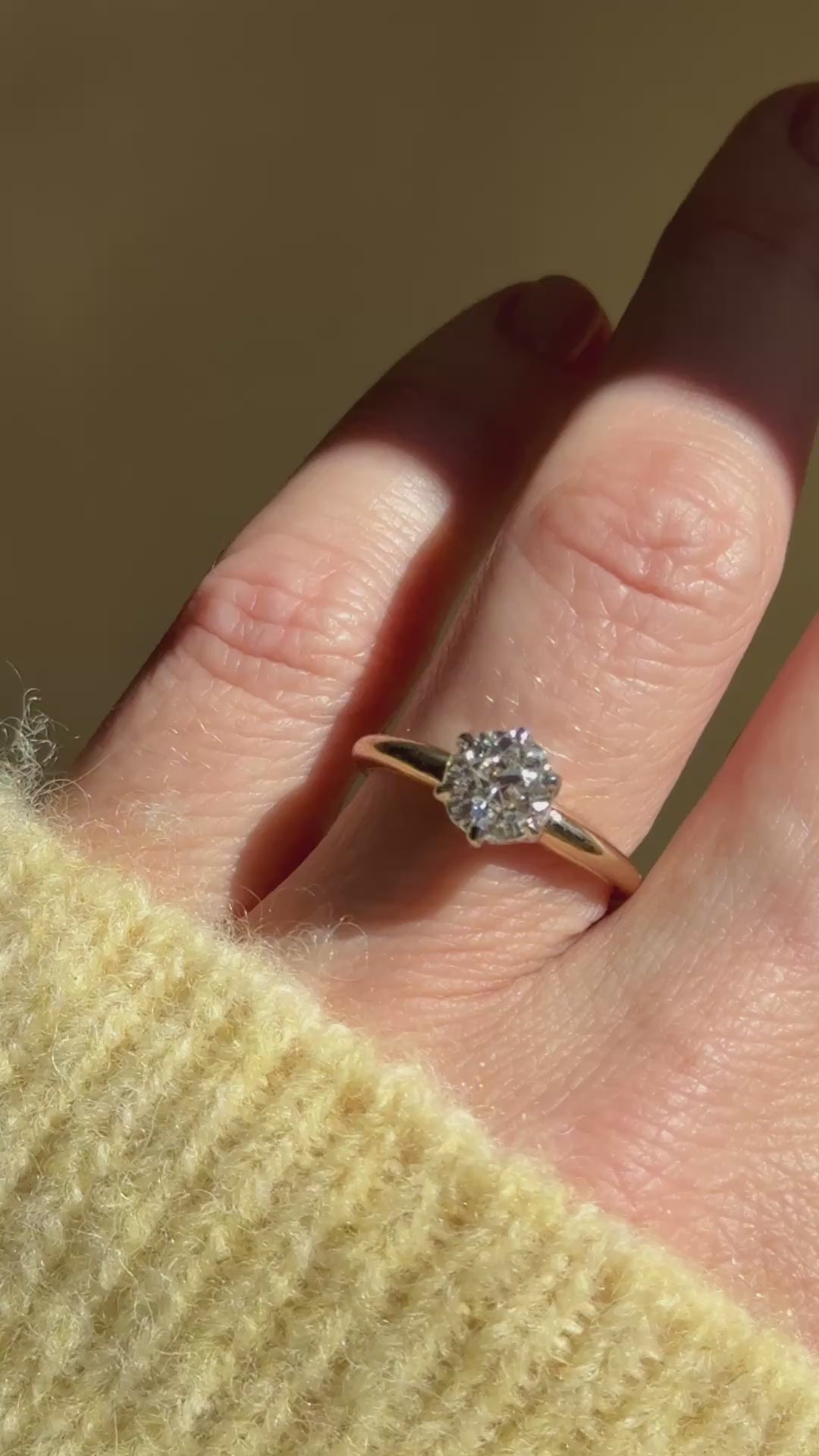 Victorian antique engagement ring centered with a GIA certified 1.29 carat old European cut diamond within a yellow gold setting. The crown style basket is open and airy, lifting the diamond slightly above the finger while keeping the overall design light. This vintage engagement ring has a softly rounded band keeping the focus on the center stone.